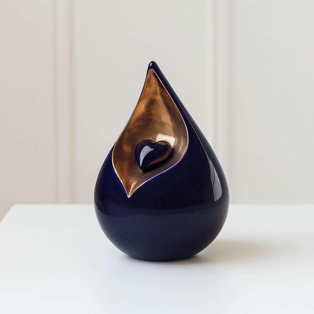 001 Celeste Keram. De Celest urn raakt direct het hart. De zachte druppelvorm, met daarin het glanzende keramische hart, straalt een serene warmte uit die troost biedt in een tijd van gemis. Alsof de vorm zelf een omhelzing is, bewaart deze urn de liefde die blijft bestaan – stil, maar krachtig aanwezig.