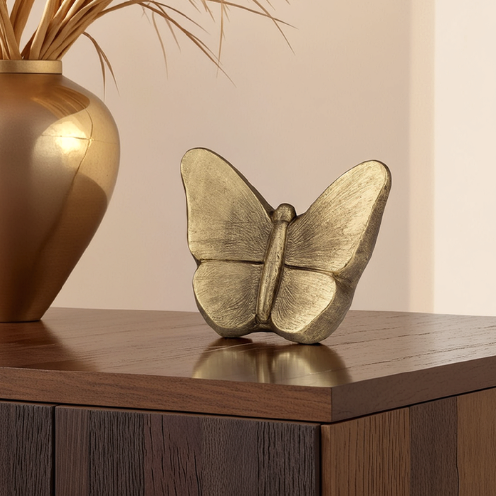 Bij deze urn speelt de vlinder een centrale rol. De verfijnde details en elegante goudkleur geven het een kunstzinnig karakter, waardoor het niet direct als urn wordt herkend. Dit unieke ontwerp is beschikbaar in drie verschillende formaten, zodat u de variant kunt kiezen die het beste bij uw wensen past.