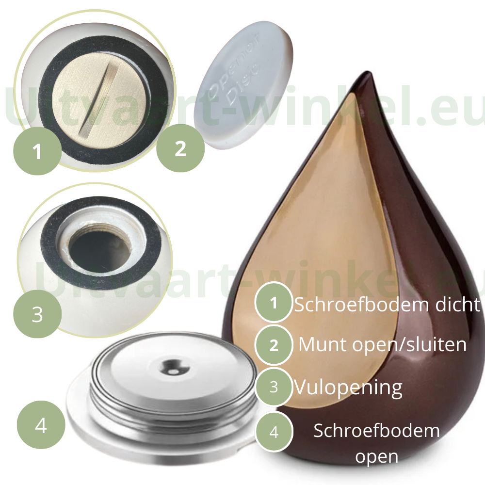 Zelf vullen kan natuurlijk ook – voor veel mensen is dat een bijzonder moment: gebruik bij voorkeur een vulset en werk op een zachte, vlakke ondergrond. Vul rustig en verdeeld, veeg restjes voorzichtig weg en sluit stevig (schroefbodem of deksel). Liever begeleiding? Het crematorium kan vaak helpen.
