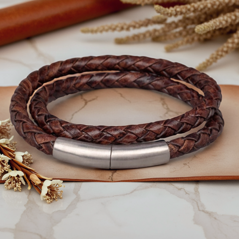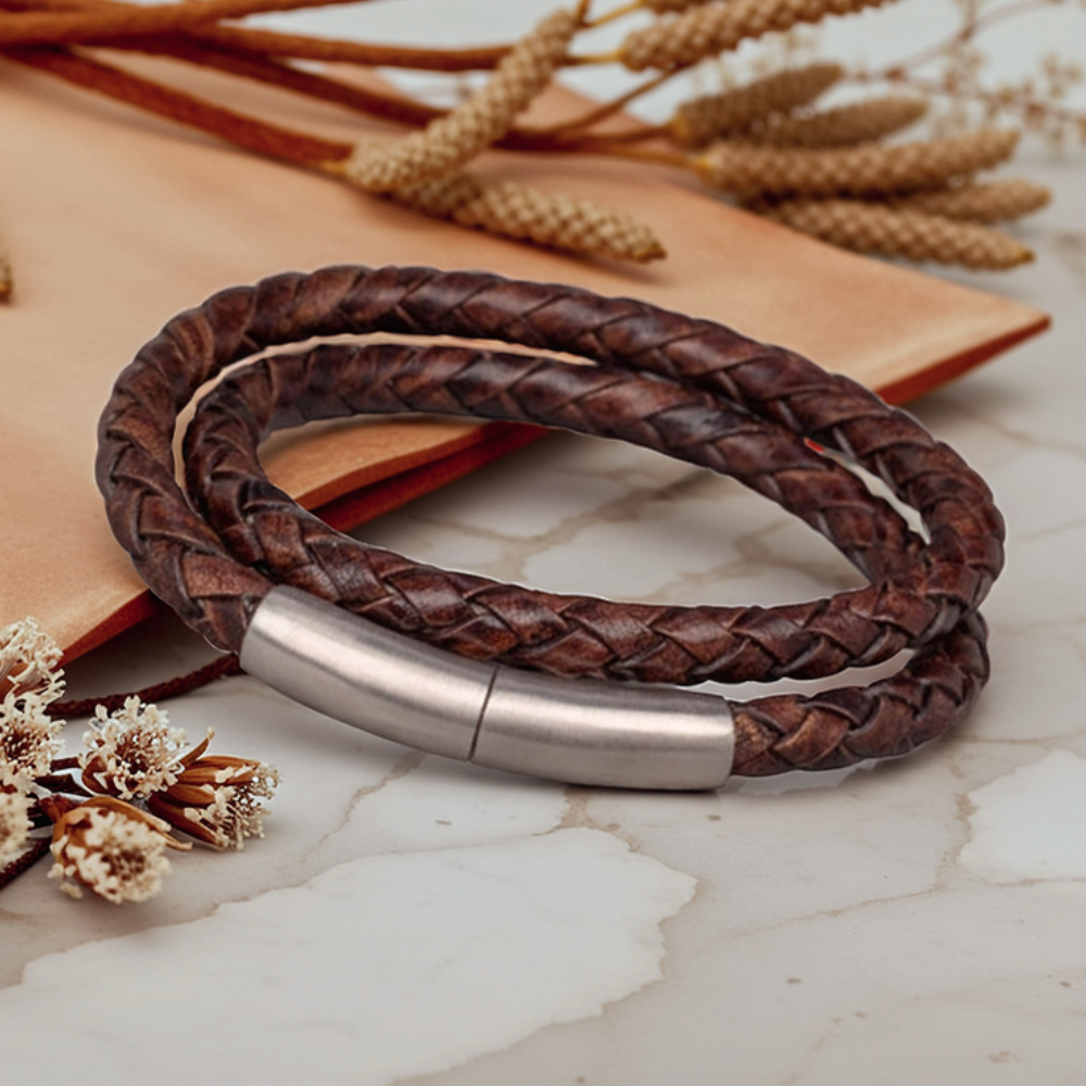 Deze unieke armbanden, ontworpen in samenwerking met ervaren designers, zijn vervaardigd uit hoogwaardig, gevlochten echt leder. Het natuurlijke materiaal vormt zich naar de drager, wordt met de tijd soepeler en ontwikkelt een eigen karakter, waardoor elke armband persoonlijk en uniek is.