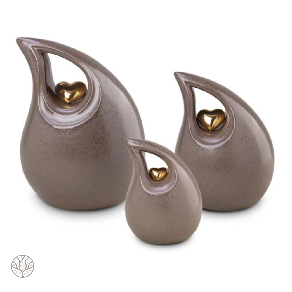 Deze goudkleurige urn brengt een zacht, warm licht naar de gedenkplek. De gracieuze druppelvorm met het kleine hart in het midden symboliseert liefde die blijft, ook wanneer woorden tekortschieten. Het glanzende keramiek geeft een verfijnde, serene uitstraling die troost en verbondenheid uitstraalt.