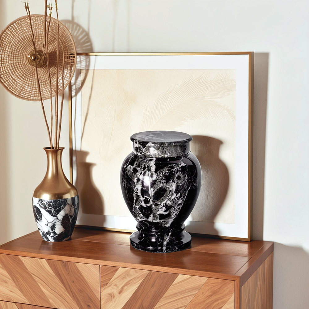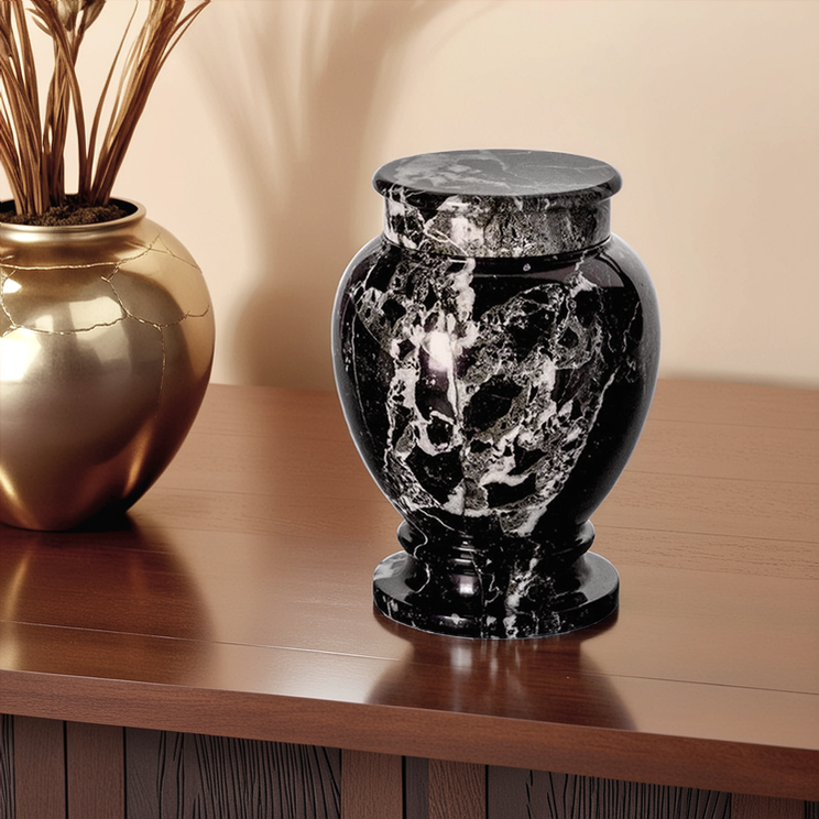 Het hoogwaardige marmer, dat voor deze urnen wordt gebruikt, is afkomstig uit Aziatische steengroeven. Uit deze groeven worden grote blokken natuursteen gekapt en vervolgens met speciale mallen bewerkt om de urn vorm te geven. Doordat elke blok natuursteen zijn eigen kleurschakeringen, kristalstructuur en aderen heeft zal geen enkele urn binnen de collectie hetzelfde zijn. Dit maakt de marmeren urnen tot een volledig natuurproduct, voorzien van een geheel eigen karakter.