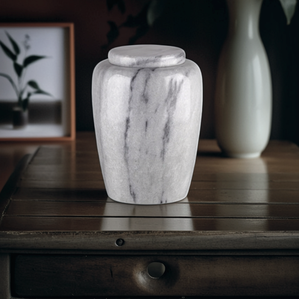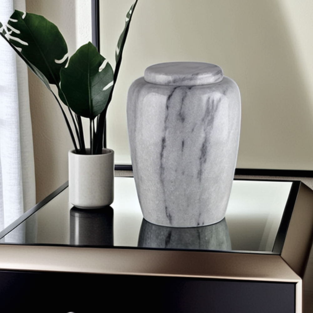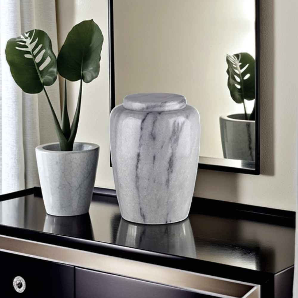 Het hoogwaardige marmer, dat voor deze urnen wordt gebruikt, is afkomstig uit Aziatische steengroeven. Uit deze groeven worden grote blokken natuursteen gekapt en vervolgens met speciale mallen bewerkt om de urn vorm te geven. Doordat elke blok natuursteen zijn eigen kleurschakeringen, kristalstructuur en aderen heeft zal geen enkele urn binnen de collectie hetzelfde zijn. Dit maakt de marmeren urnen tot een volledig natuurproduct, voorzien van een geheel eigen karakter.